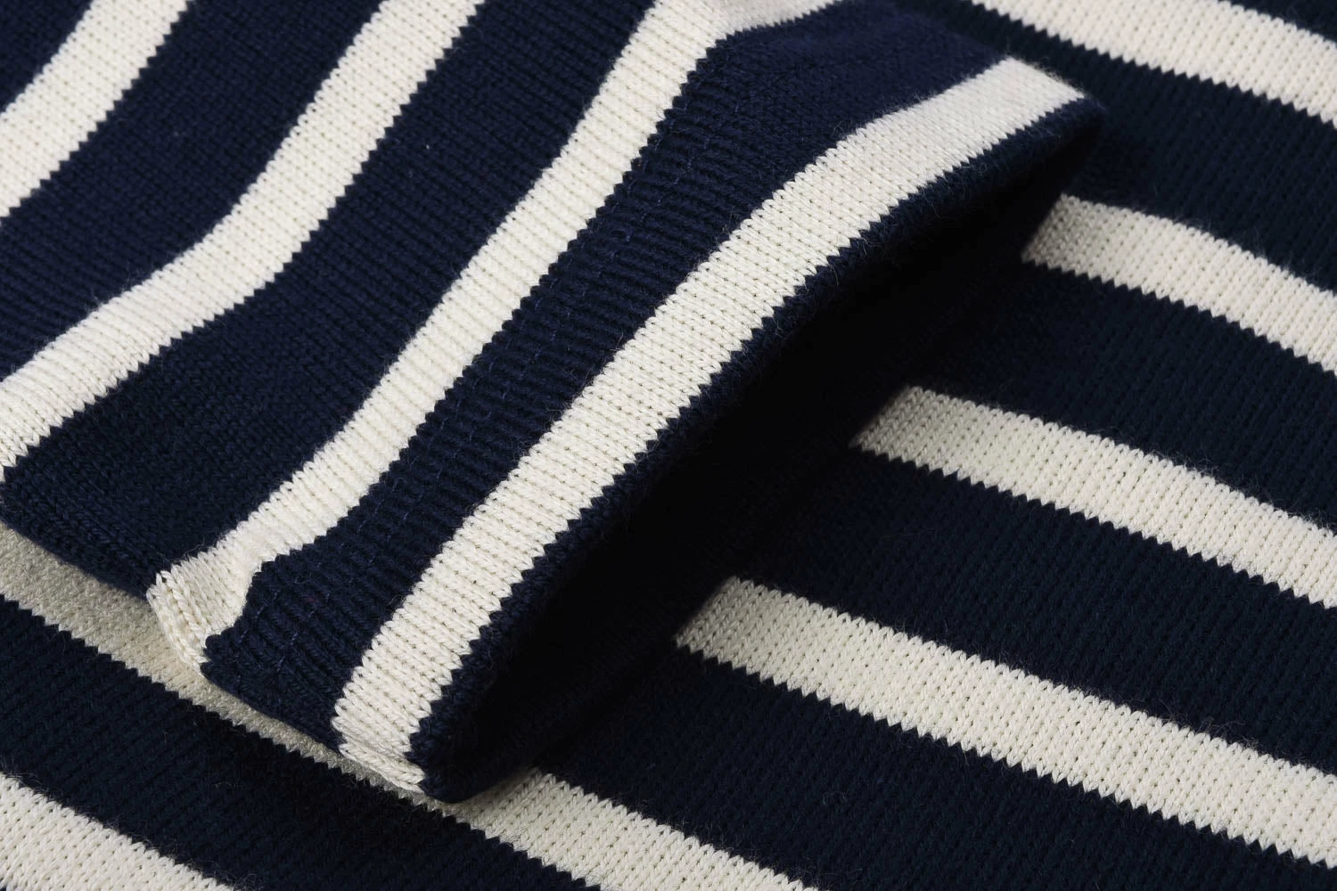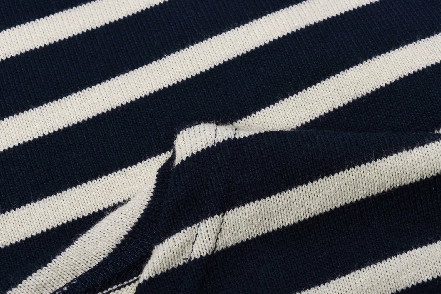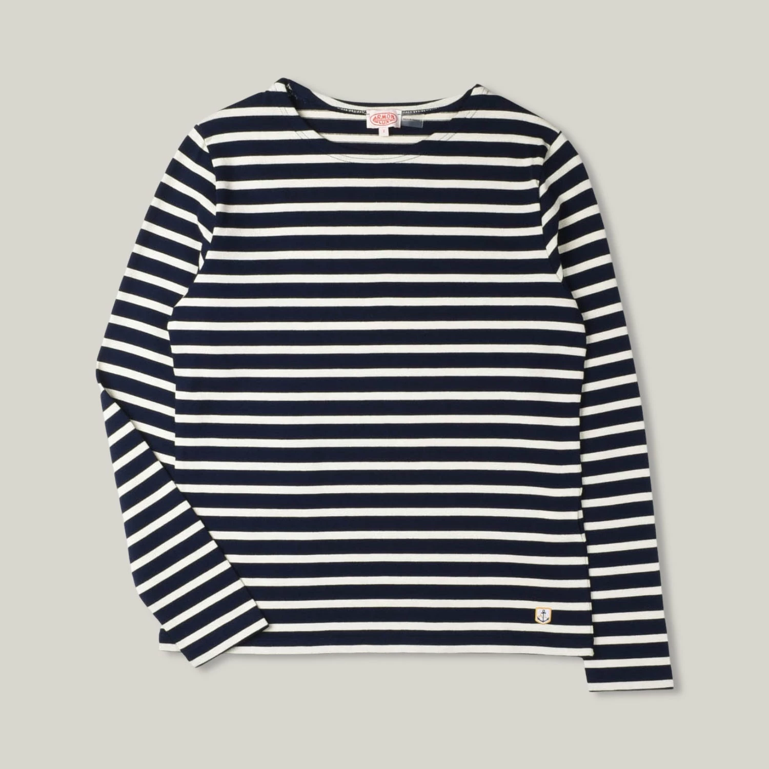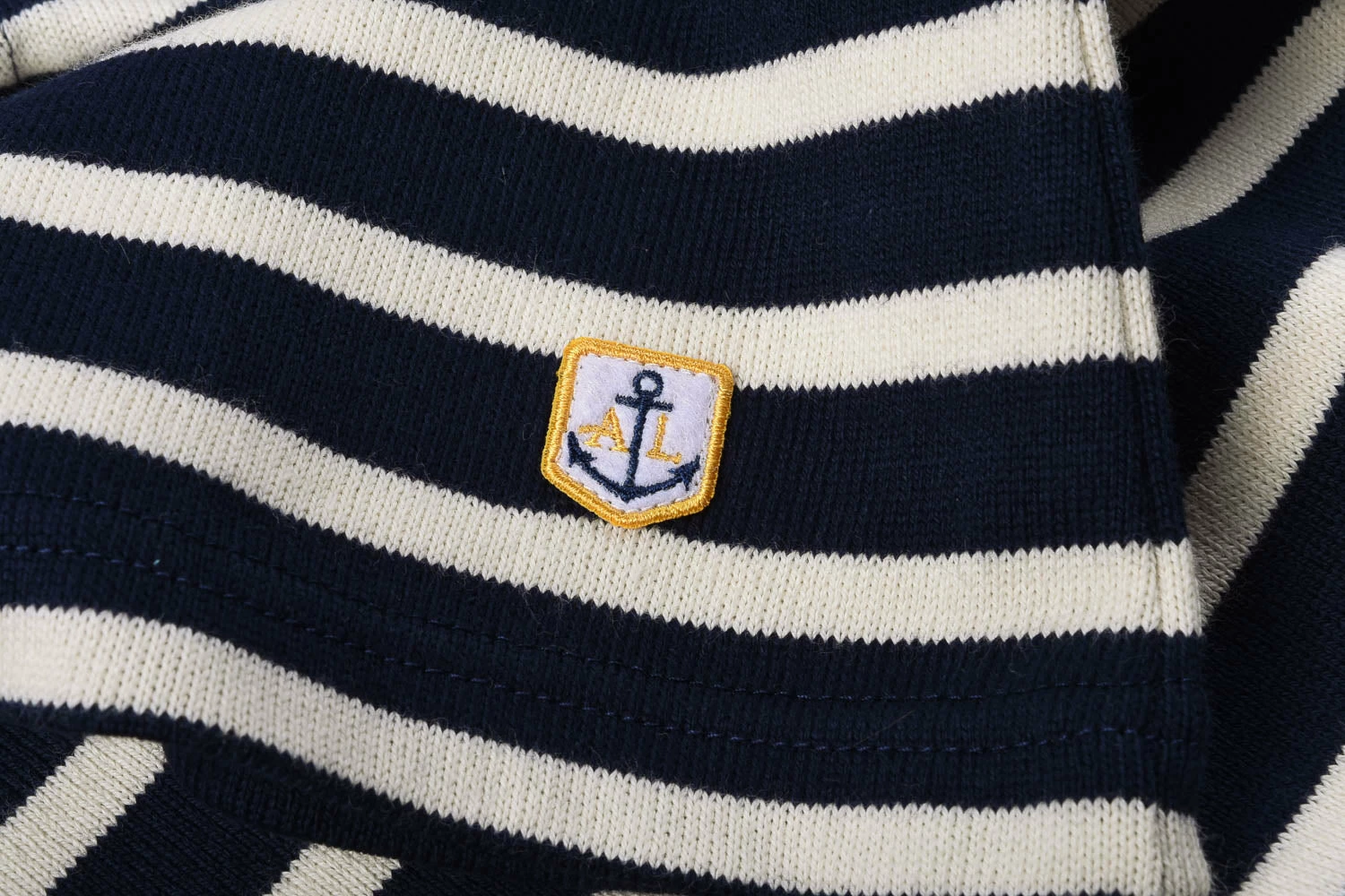 Classic French Breton striped shirt, made of thick soft cotton. It has a loose silhouette, perfect for layering or solo use. Looks good on a bicyclette. Embroidered anchor logo on base.
