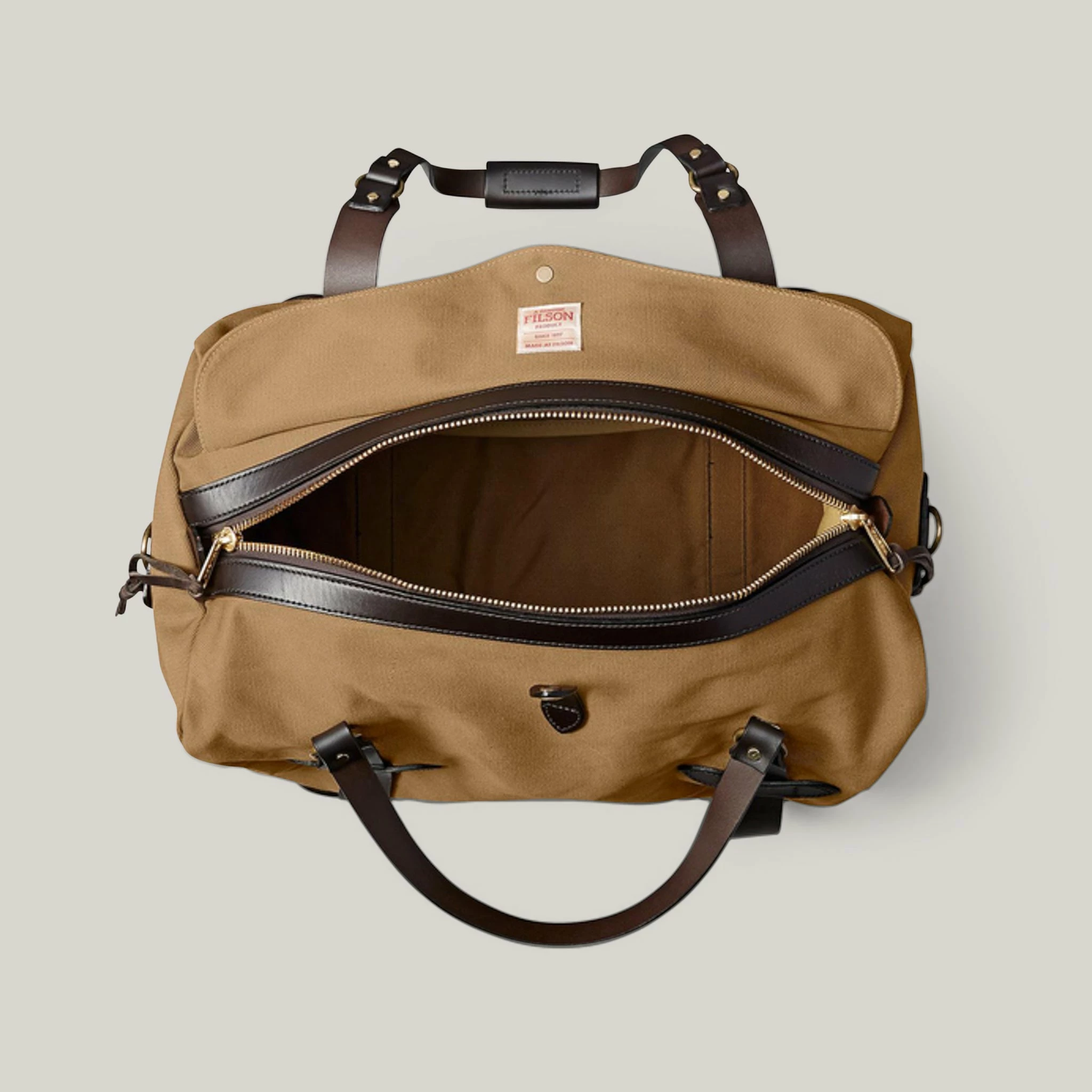 - Solid brass zipper closure custom cut at Filson with storm flap for added security