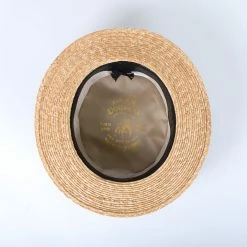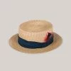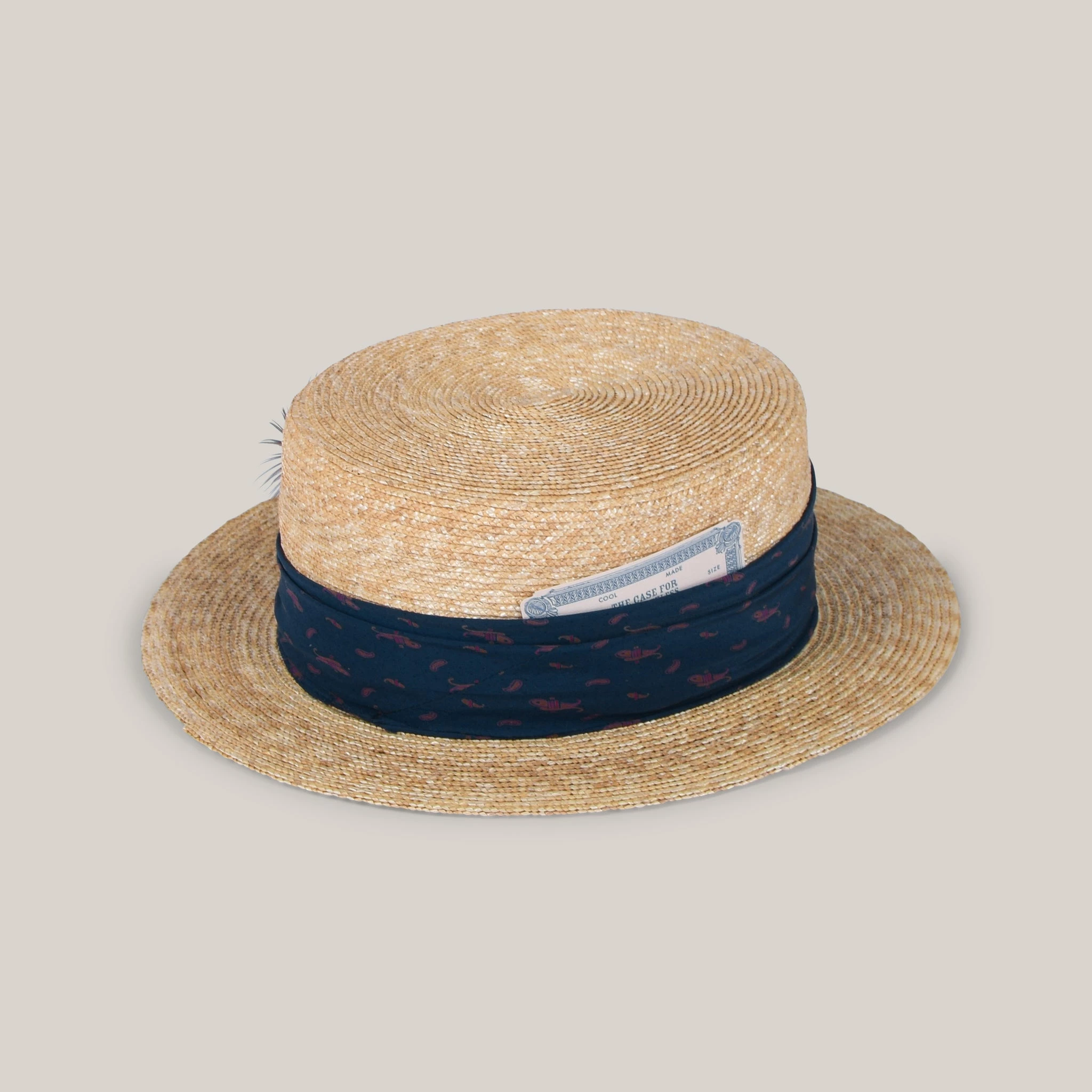 The Boater is sewn from flat wheat grass straw, into a classic Cankan style hat with a flat crown, and short brim. Each piece features a different ribbon made from a disassembled vintage silk tie, making it unique to the wearer.