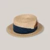 The Boater is sewn from flat wheat grass straw, into a classic Cankan style hat with a flat crown, and short brim. Each piece features a different ribbon made from a disassembled vintage silk tie, making it unique to the wearer.