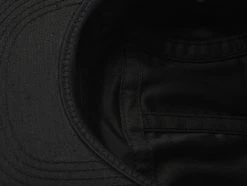 Taking inspiration from hiking caps of late last century, this 5 panel cap has been made in black ‘neppy’ cotton twill to add texture, with toggle to adjust at the back and front strap for headlights or cigarettes. One size.