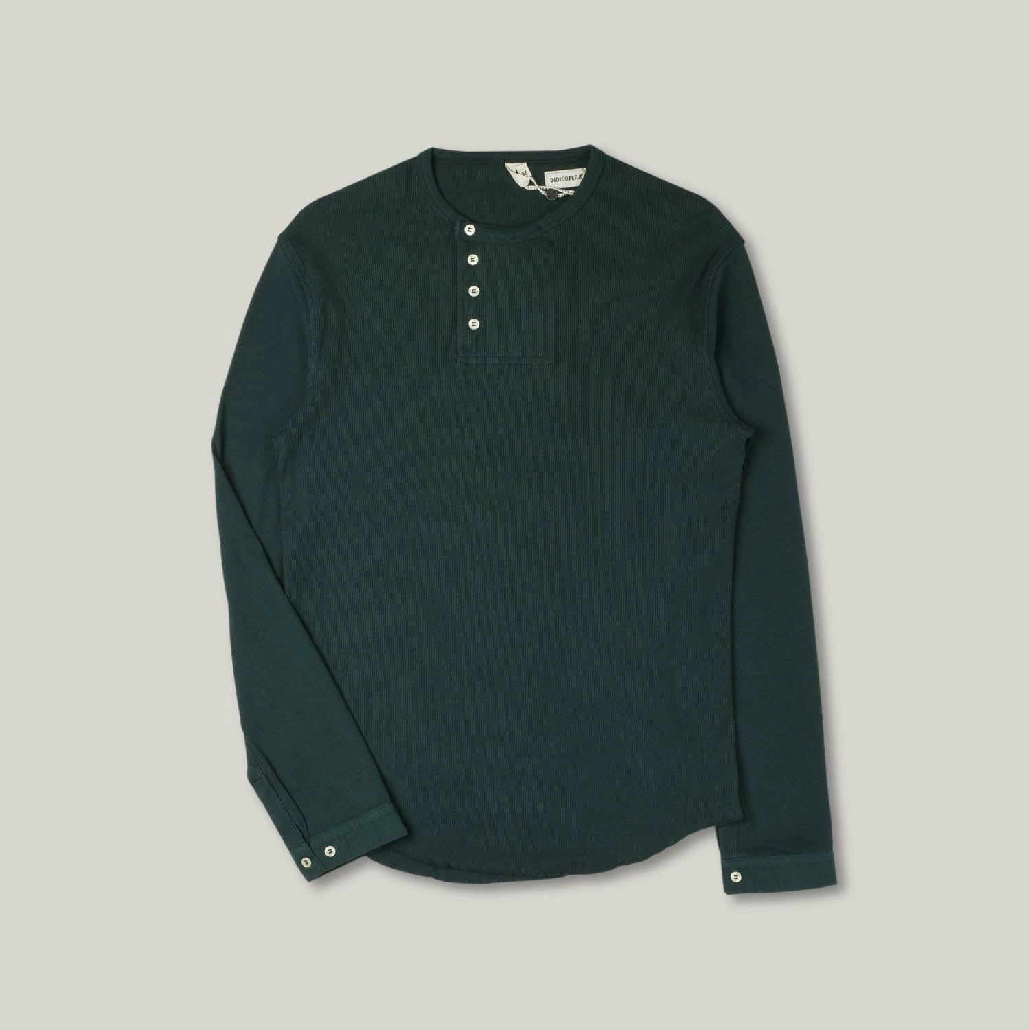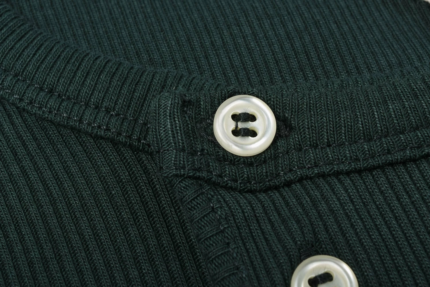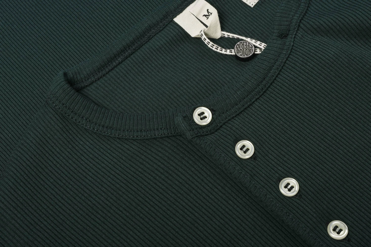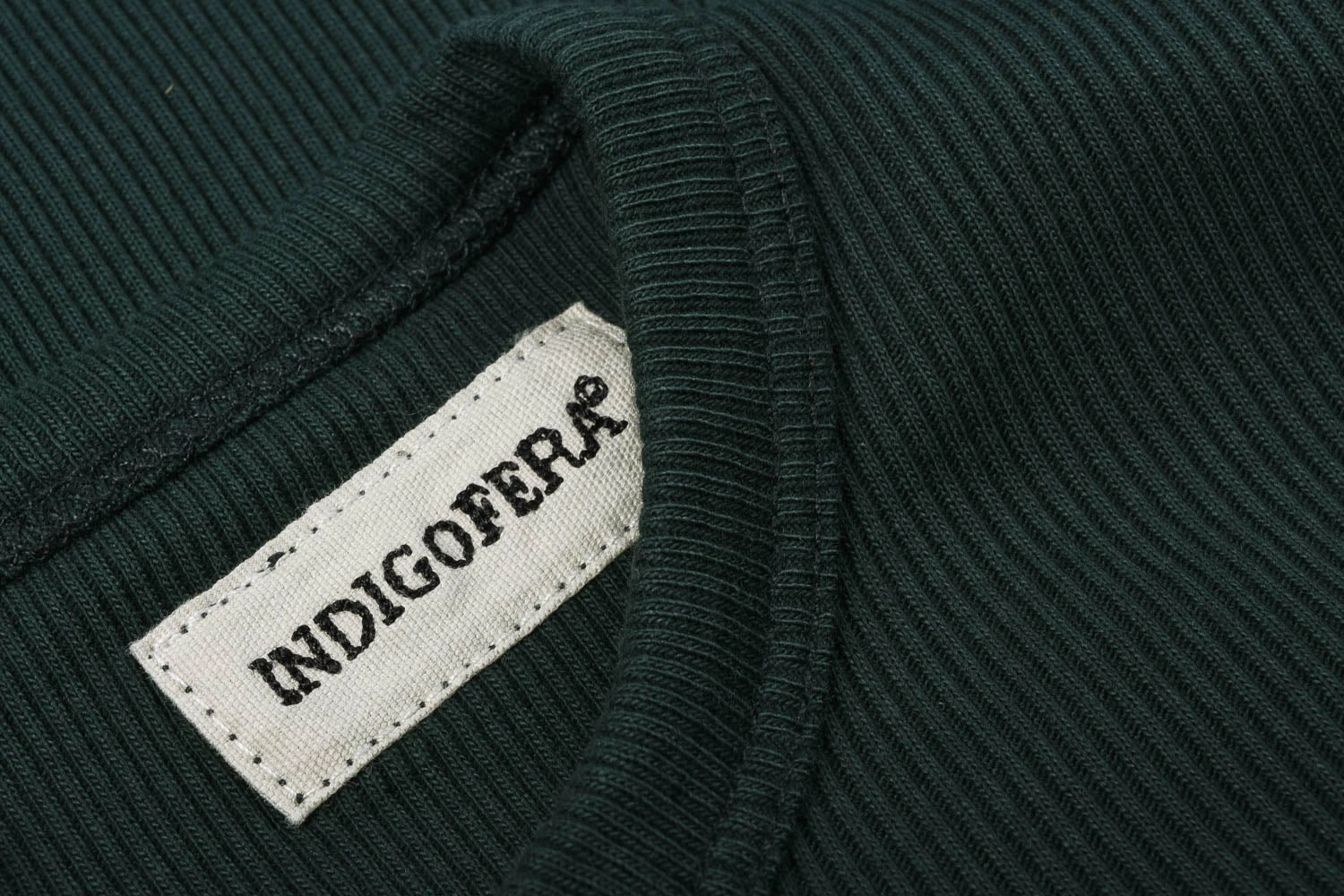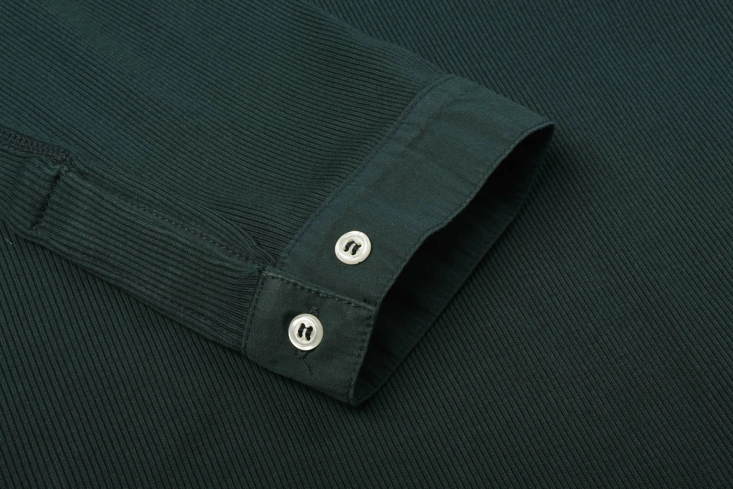 A smart yet simple henley based on a vintage style with a large poplin placket and offset buttons. The fabric is ribbed pima cotton so is soft and strong, the style is fitted but as with all Indigofera sizing, it is fairly standard and true to size. Further details include buttoned cuffs. The colour of phthalo green was first introduced in 1938 and stems from Copper phthalocyanine, the group of sythentic blue pigment dyes.