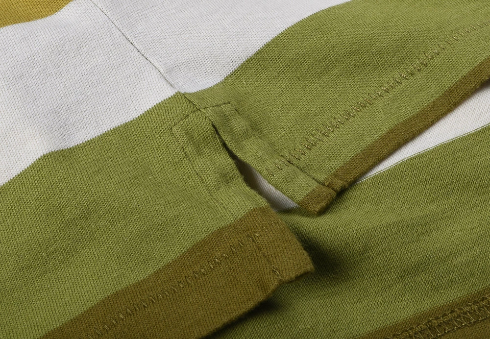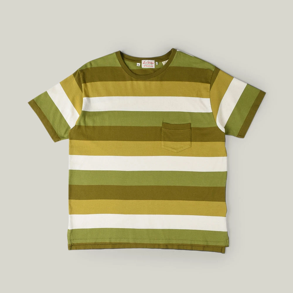 The striped tee from LVC is a staple piece with the decade they choose varying from piece to piece and season to season. This one from the 1940’s, sometimes they just get the striep combination bang on and this is such a time, with green & ecru stripes, split side seams and a vintage fit, i.e, slimmer in the body and slightly more fitted arms. ‘Very Stand By Me’