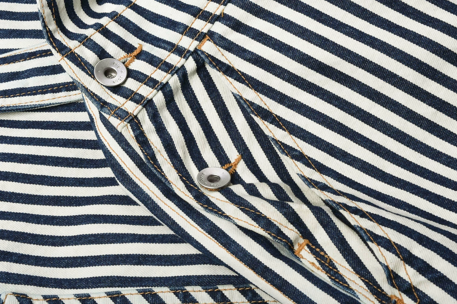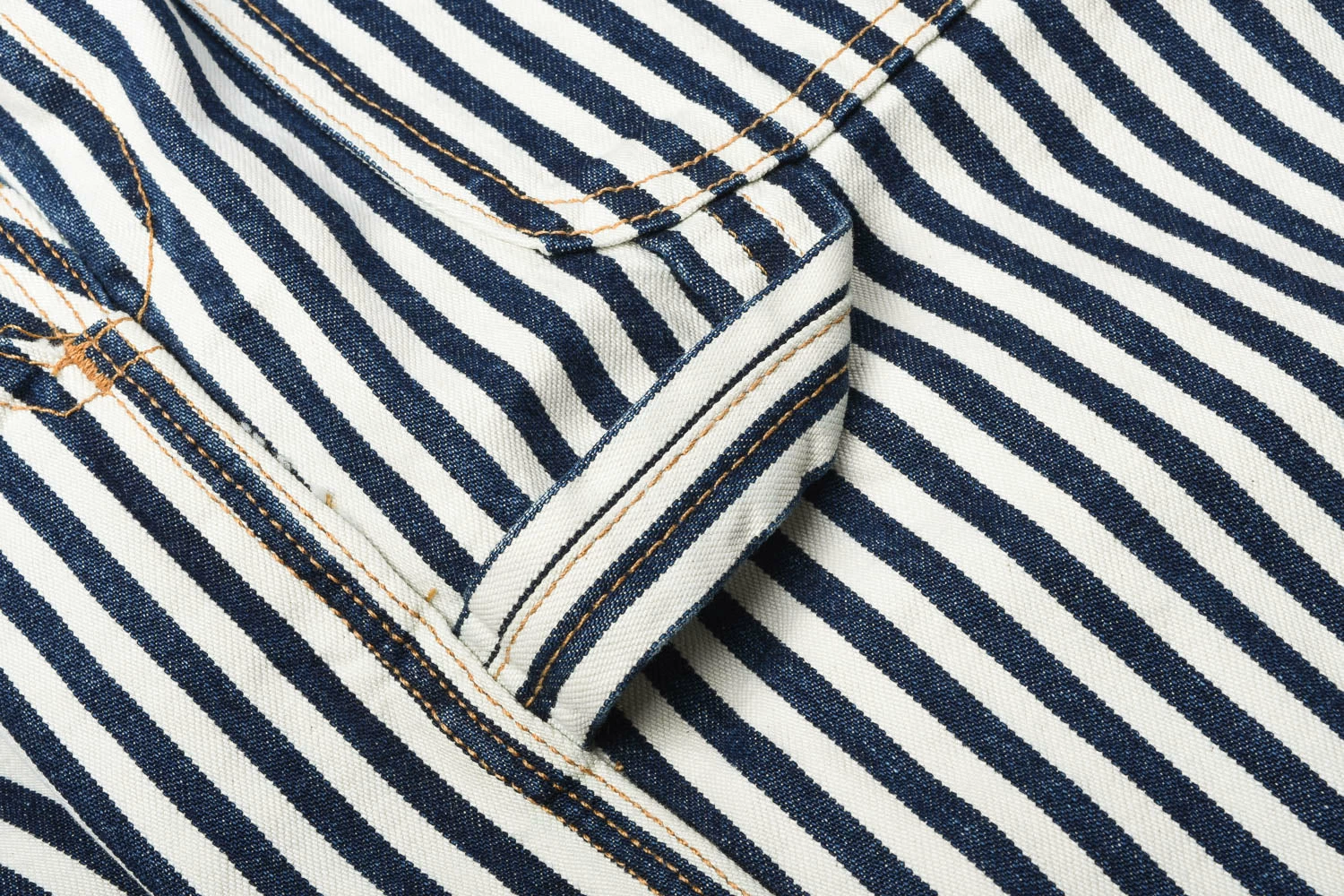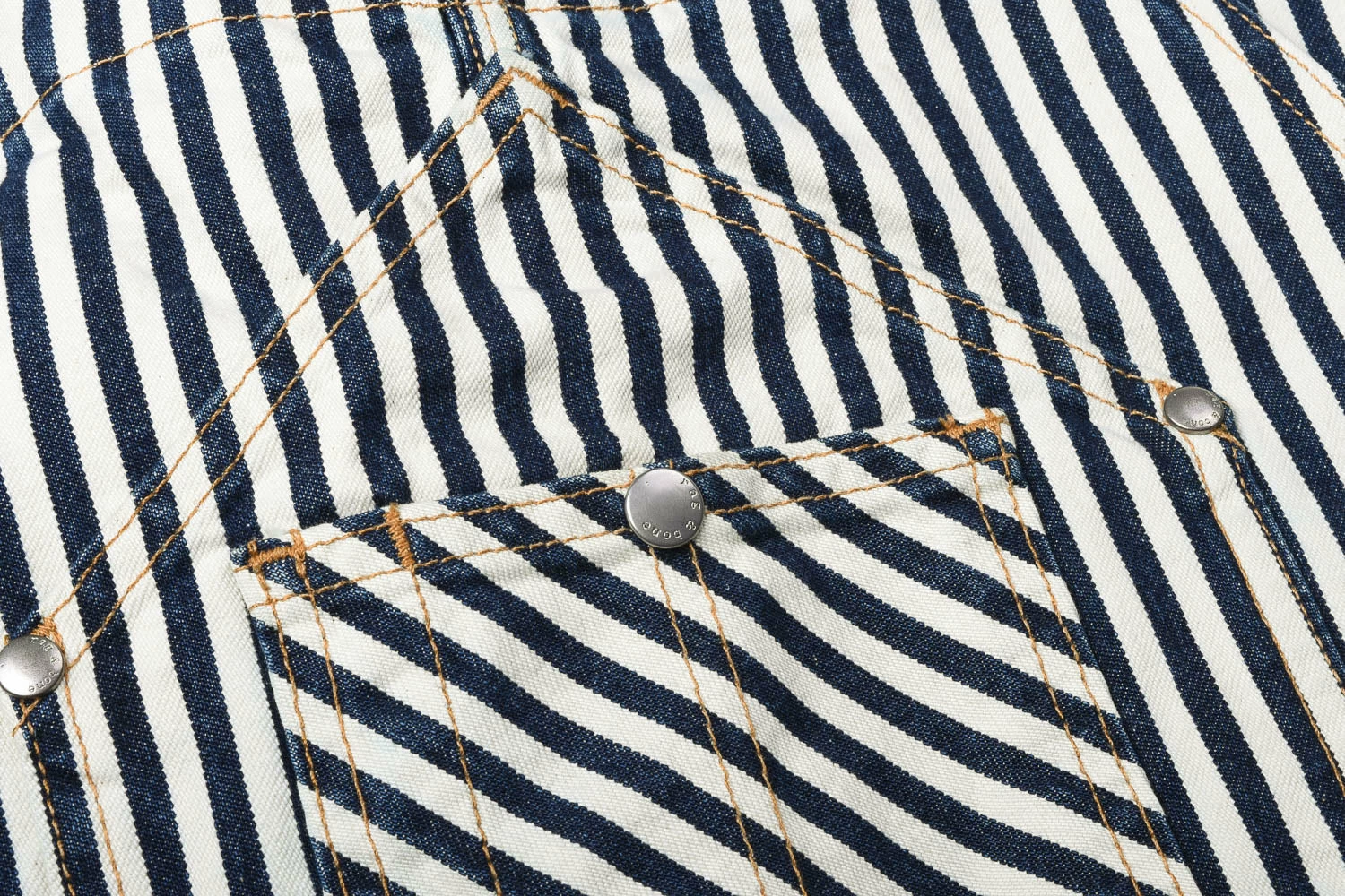 Ladies overalls in a classic workwear hickory stripe. made in 100% cotton, these are designed to be a loose fit at the bust and waist with a wide, slight flared leg. Details include a triangular shaped front pocket with extra twin pocket attached. On the rear are tool loop on left and ruler pocket on right.